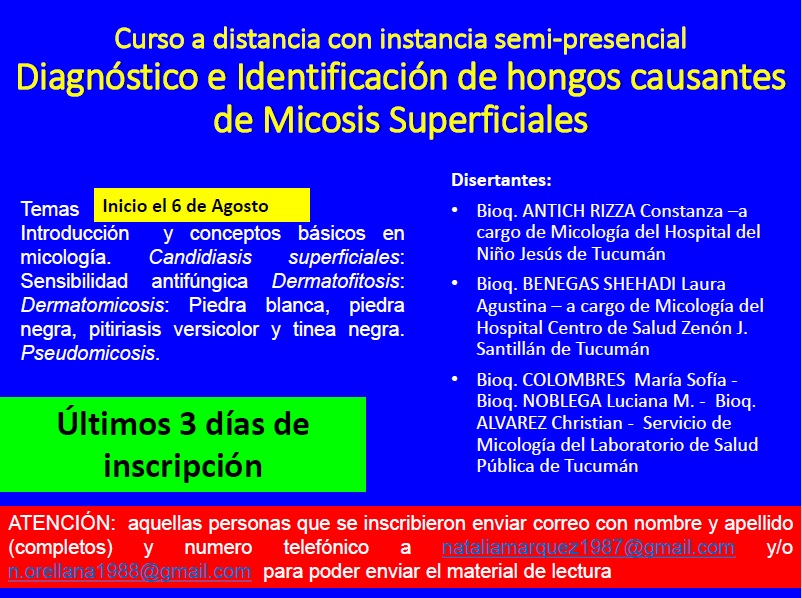 Inscripción. Los interesados deberán inscribirse a partir del 5 de Julio hasta el 6 de Agosto a las 16:00 en el Colegio de Bioquímicos de Tucumán. Al momento de la inscripción deben dejar asentado en la planilla de inscripción su correo electrónico y número de teléfono, además de solicitar la hoja con las indicaciones pertinentes para la recepción del material de lectura. Nº de contacto: +54-381-5027722