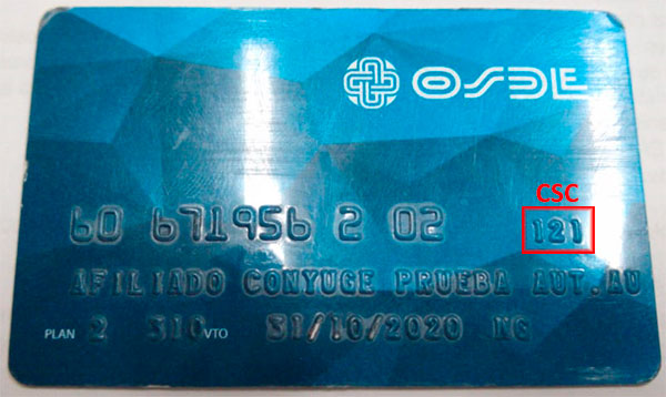 - OSDE, se incorpora el CSC (Codigo de seguridad de credencia). El mismo es un codigo de 3 digitos que se encuentra en la credencial luego del numero de afiliado, se deja imagen adjunta como ejemplo. Dicho codigo debe ser ingresado al momento de validar al paciente.