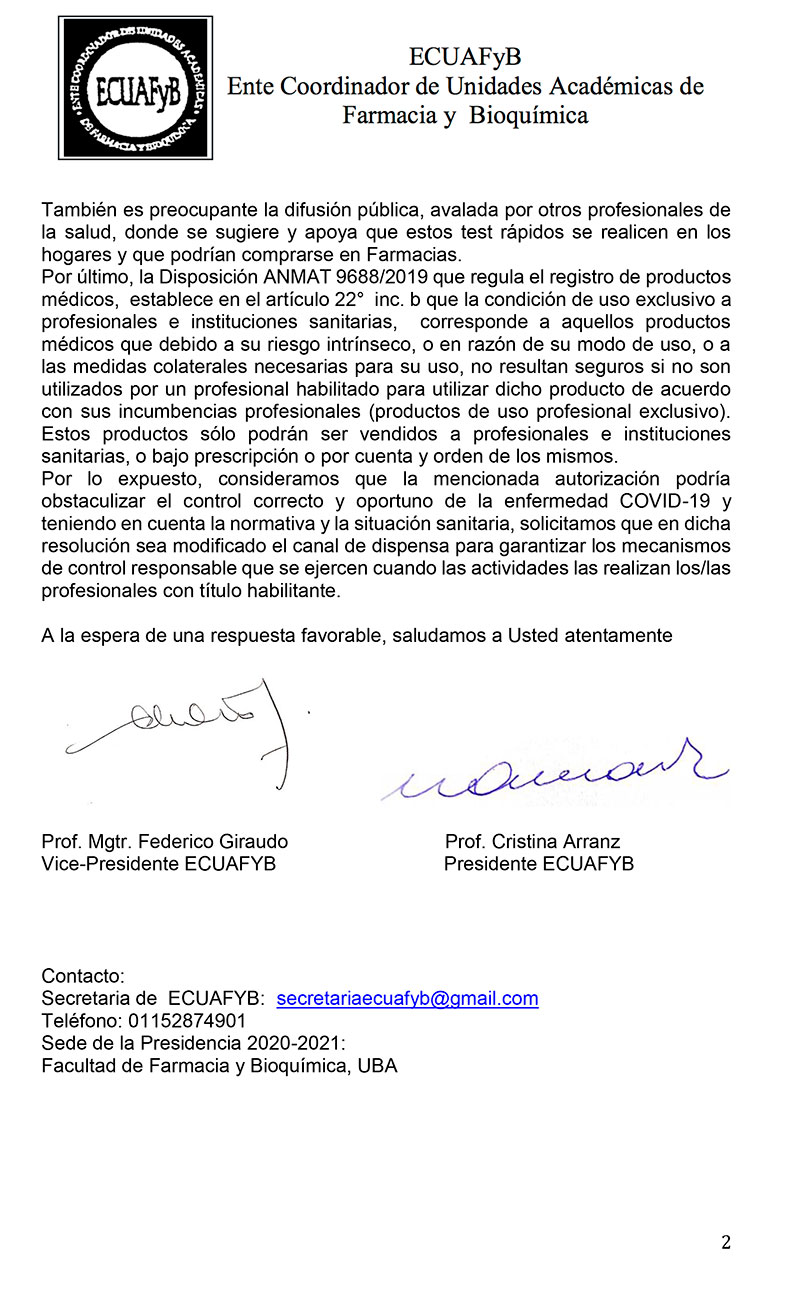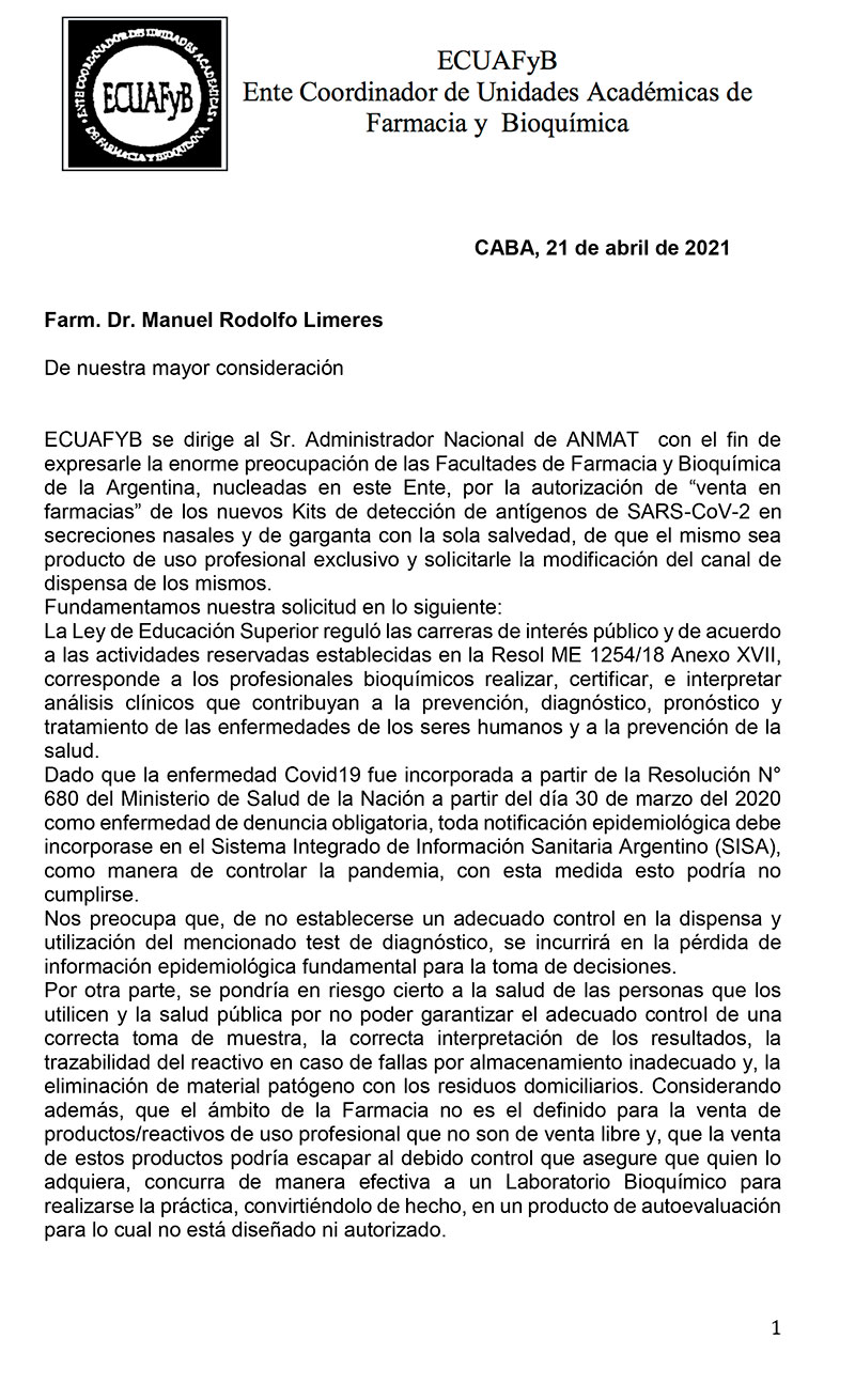 Carta a la ANMAT por venta de kits de diagnóstico en farmacias