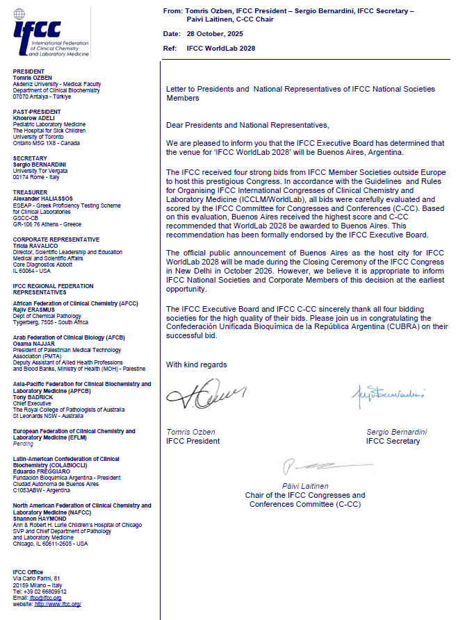 Estimados colegas estamos felices de anunciar que el XXVIII IFCC WORLDLAB 2028 se realizara en la ciudad de Buenos Aires.