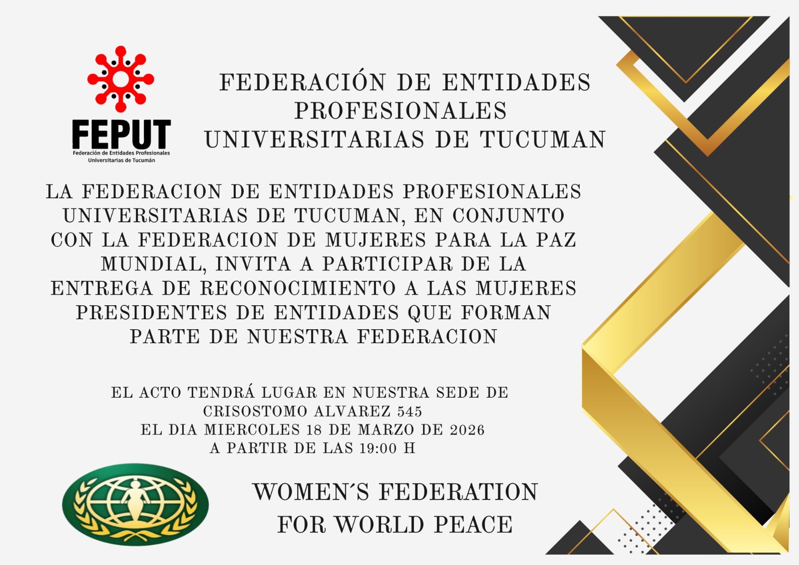 En el marco del Mes de la Mujer, la Federación de Entidades Profesionales Universitarias de Tucumán realizó este 18 de marzo un acto de reconocimiento a presidentas de colegios y entidades profesionales, en una ceremonia cargada de calidez, gratitud y valoración por sus trayectorias.